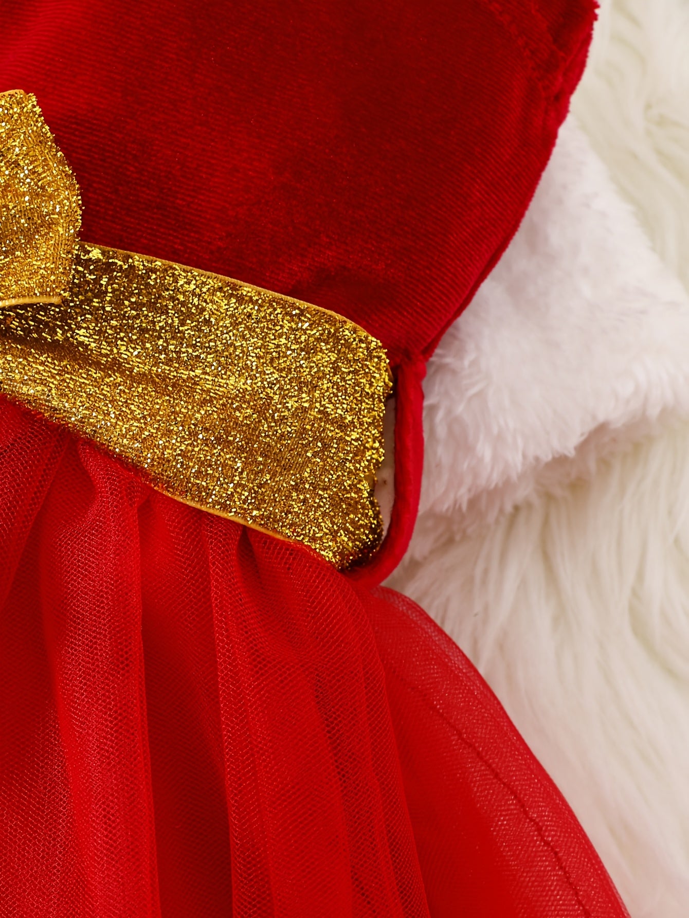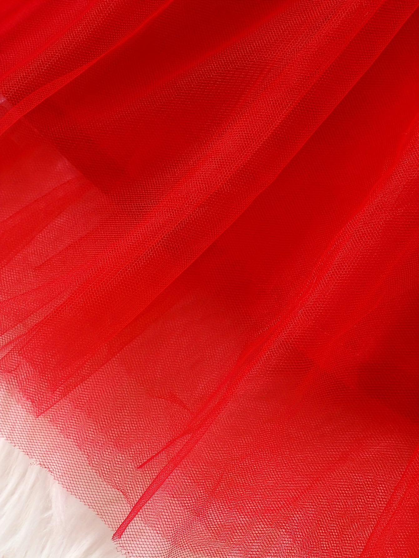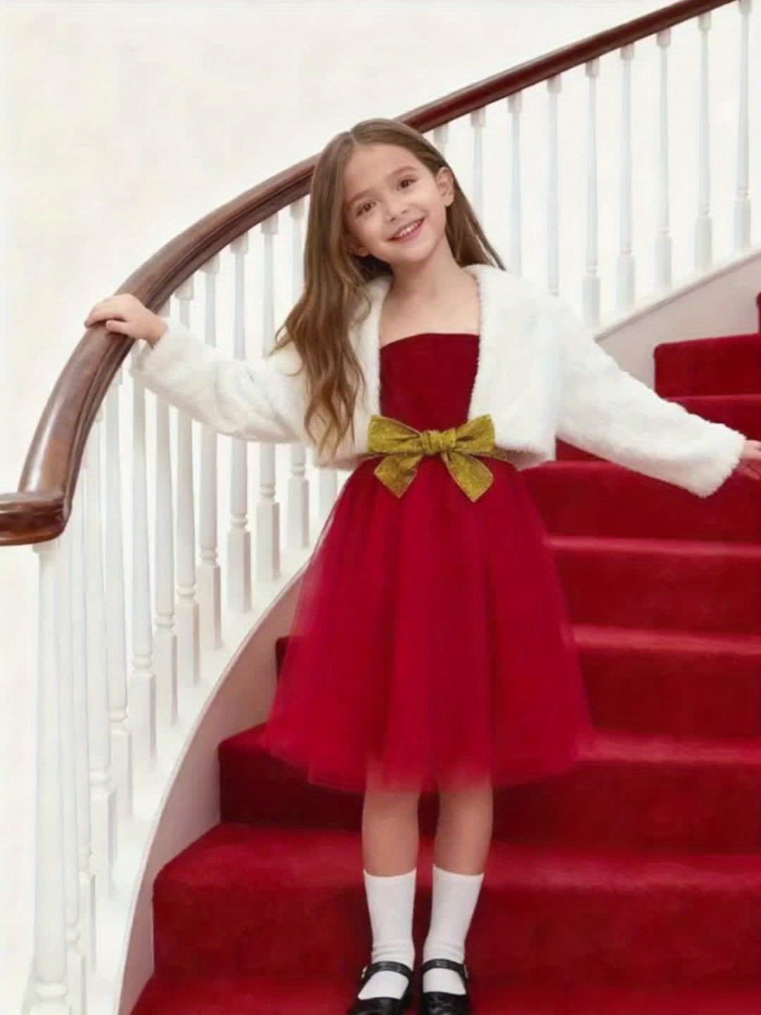 2pc Girls' Furry Coat & Spaghetti Strap Mesh Dress Set