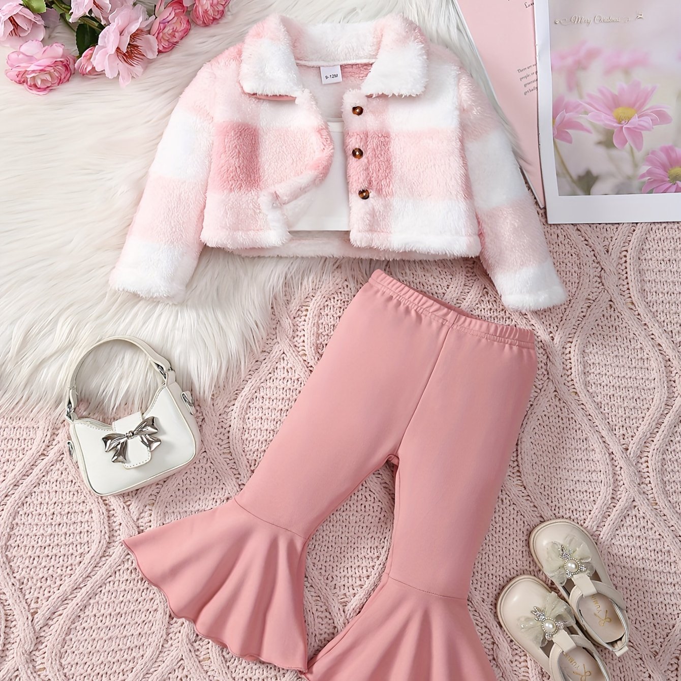 Weaving Method: Knit Fabric3pcs Baby's Warm Fuzzy Plaid Pattern Jacket + Cami Top + Trendy Bell-bottom Pants, Toddler & Infant Girl's Clothing Outdoor Set, Outdoor Cloth