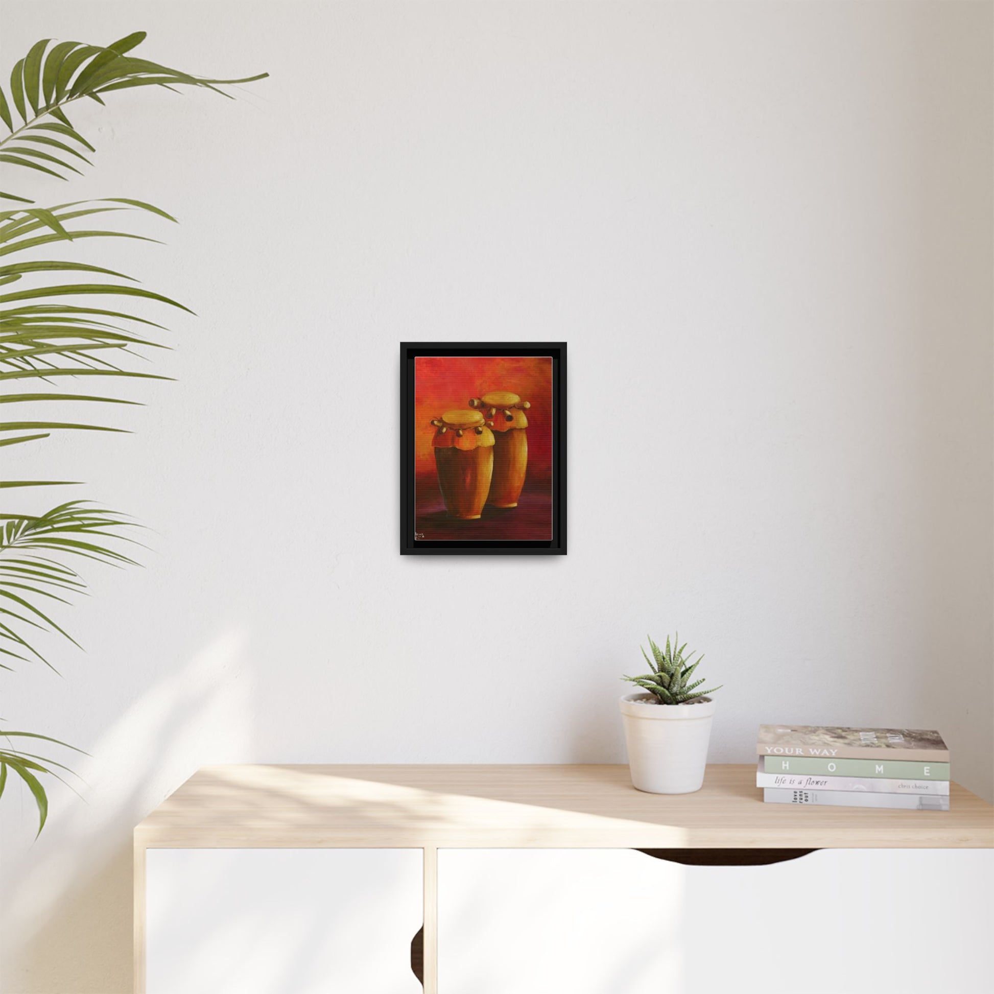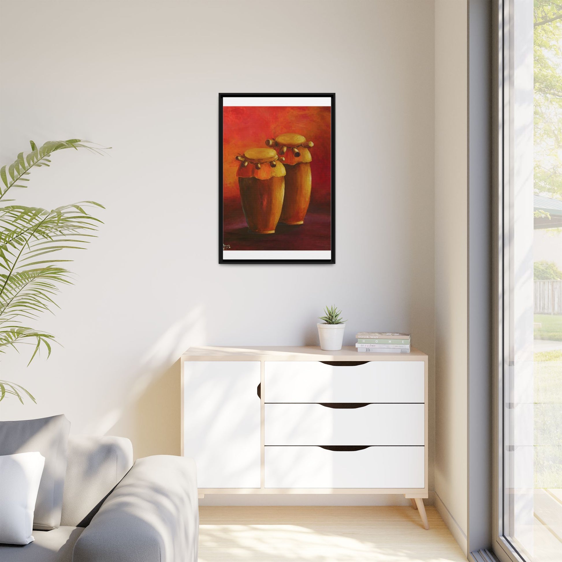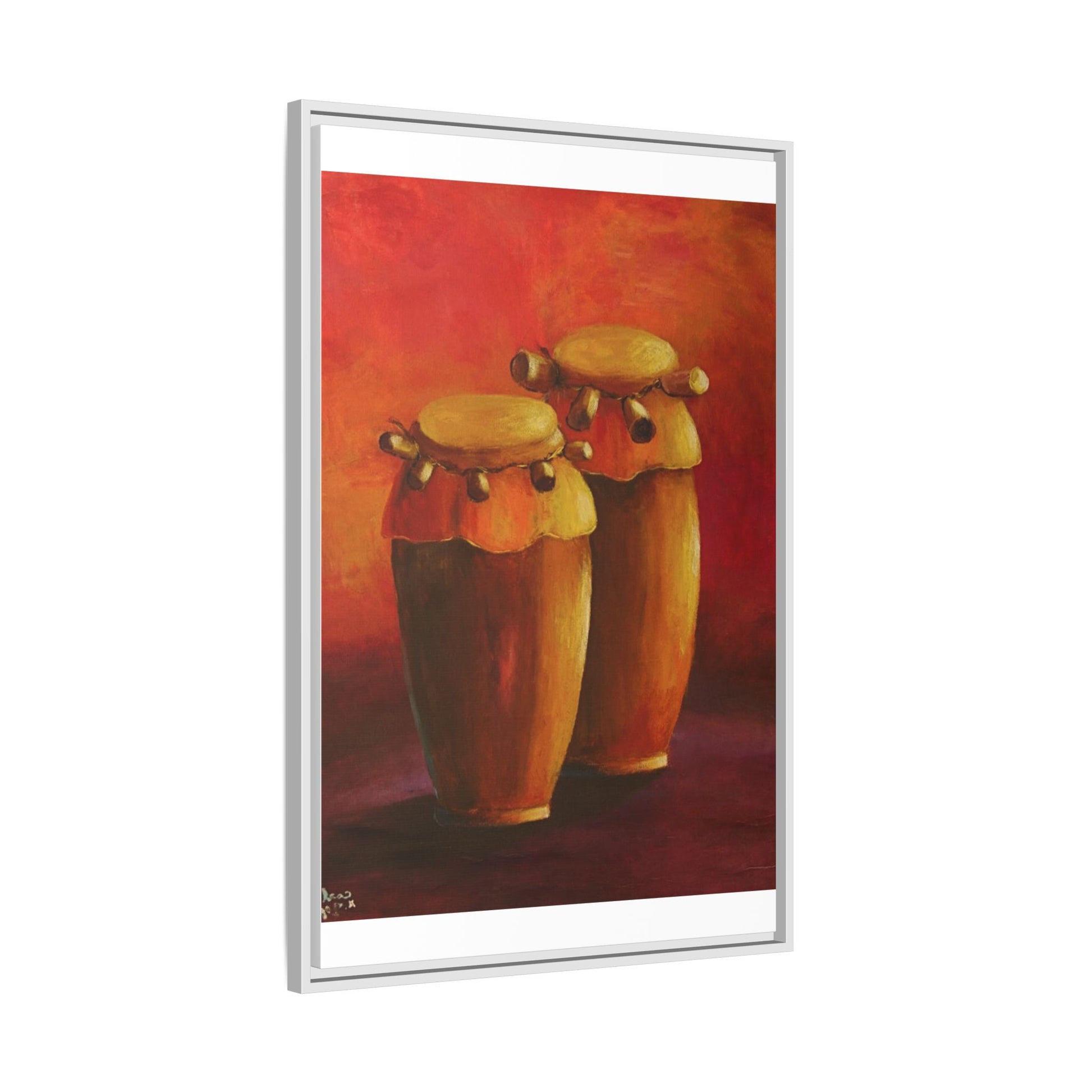 A vibrant Haiti cultural drum design on a matte canvas, framed in multi-color options. This unique canvas print is perfect for those looking to add a touch of cultural elegance to their space. Ideal for fans of Haitian culture or anyone looking to celebrate Haitian holidays and festivities.