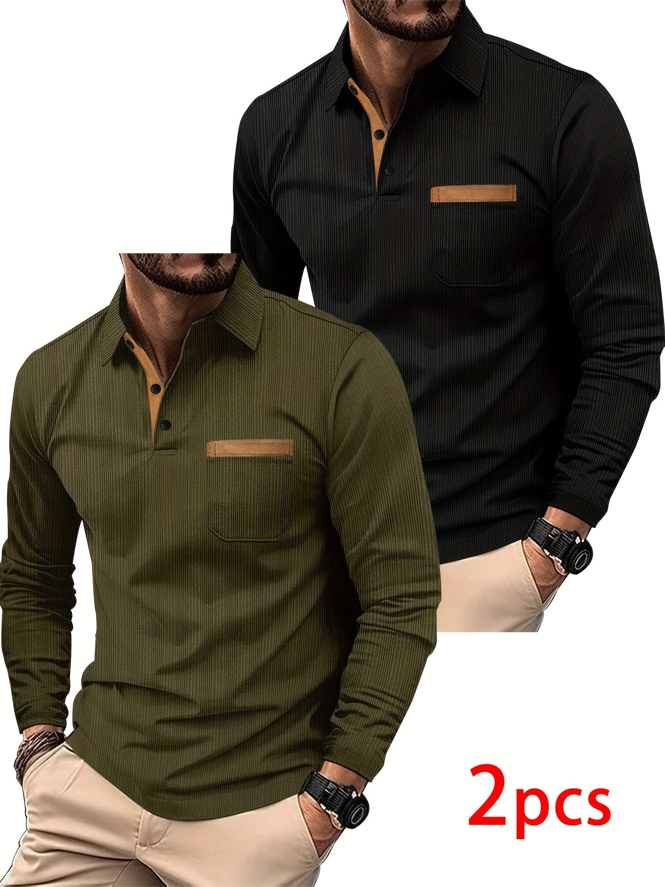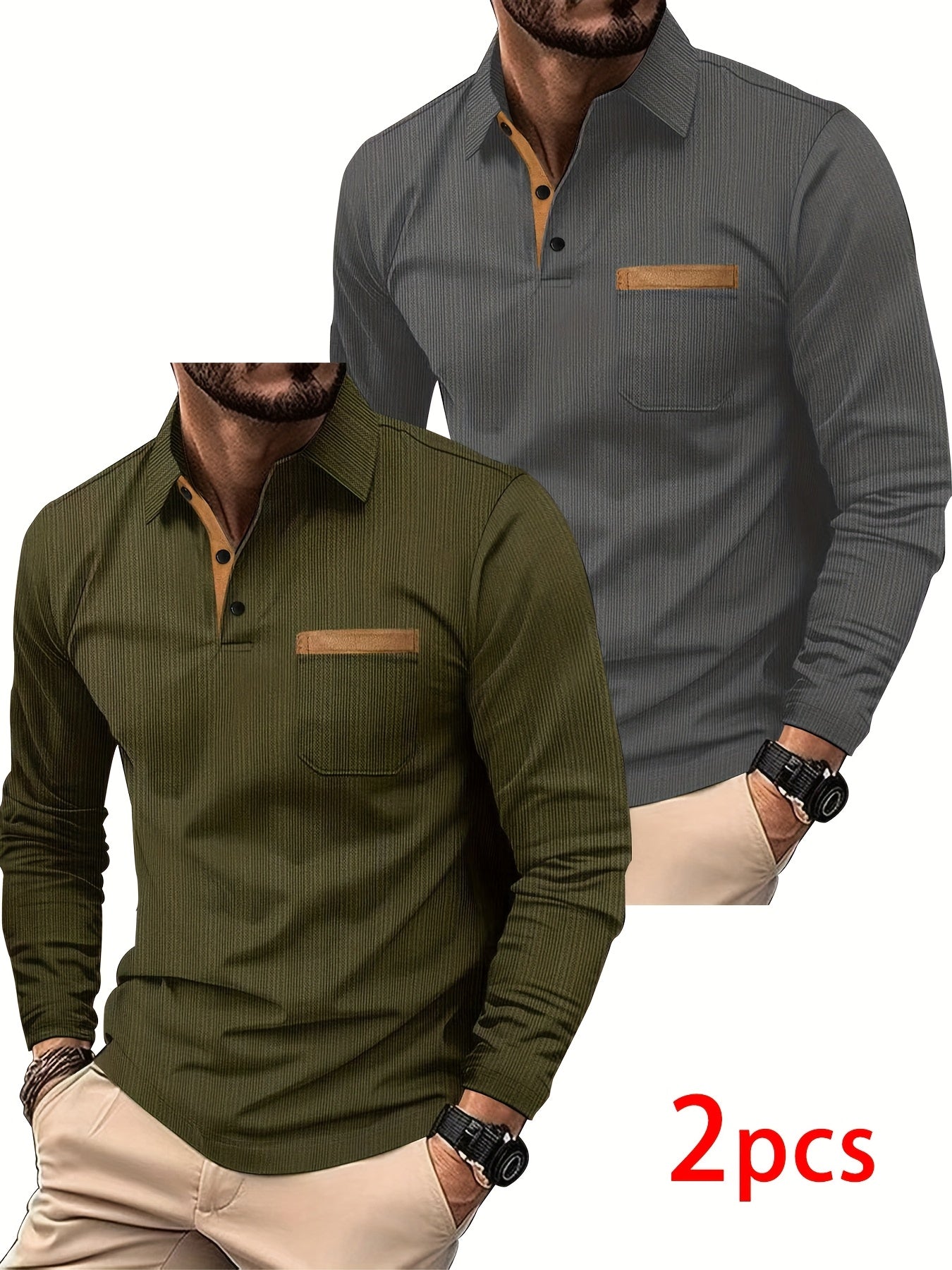 Pearson OBM Men'S Jacquard Color-Blocked Golf Polo Shirt, a Set of 2 Casual And Comfortable Long-Sleeve Polo Shirts.