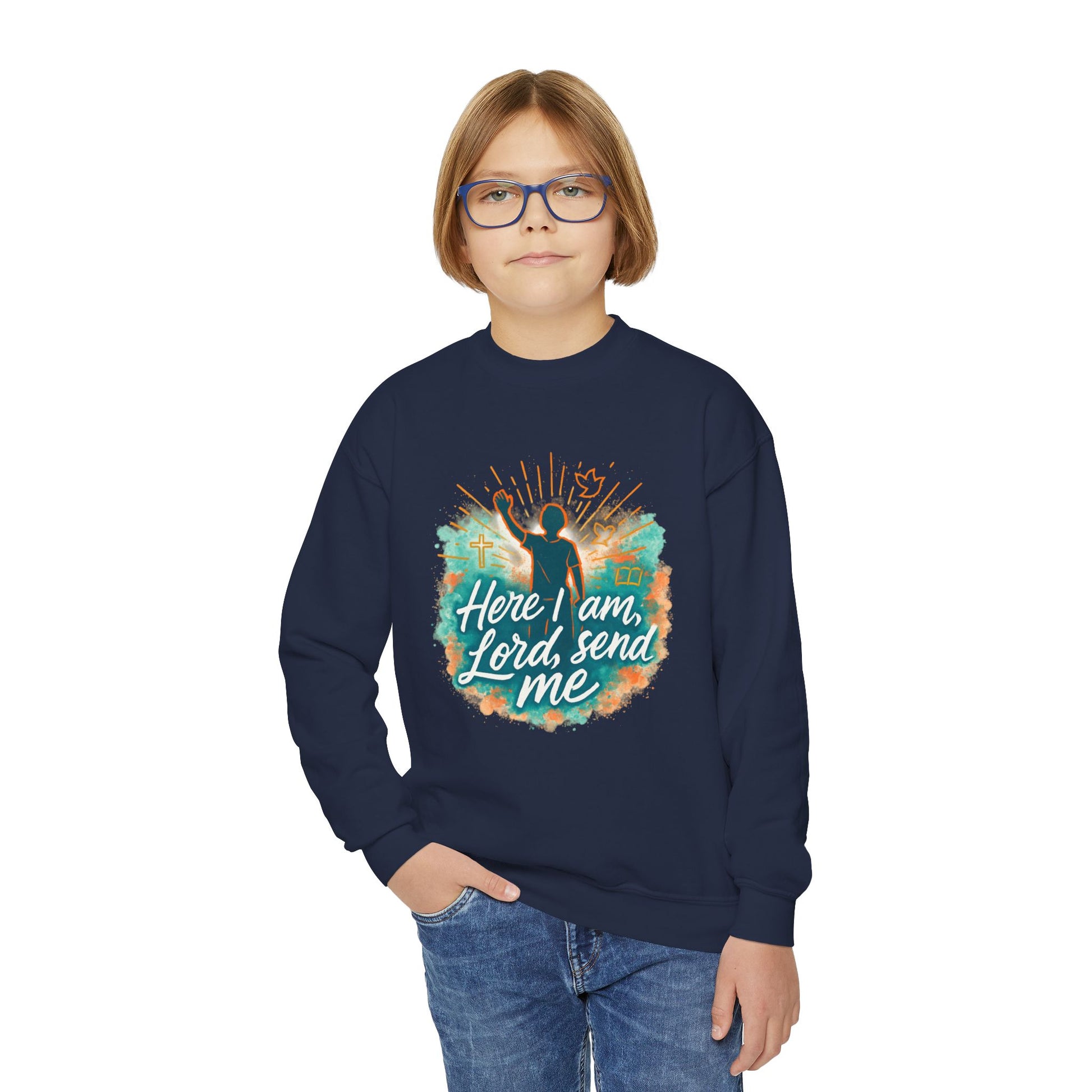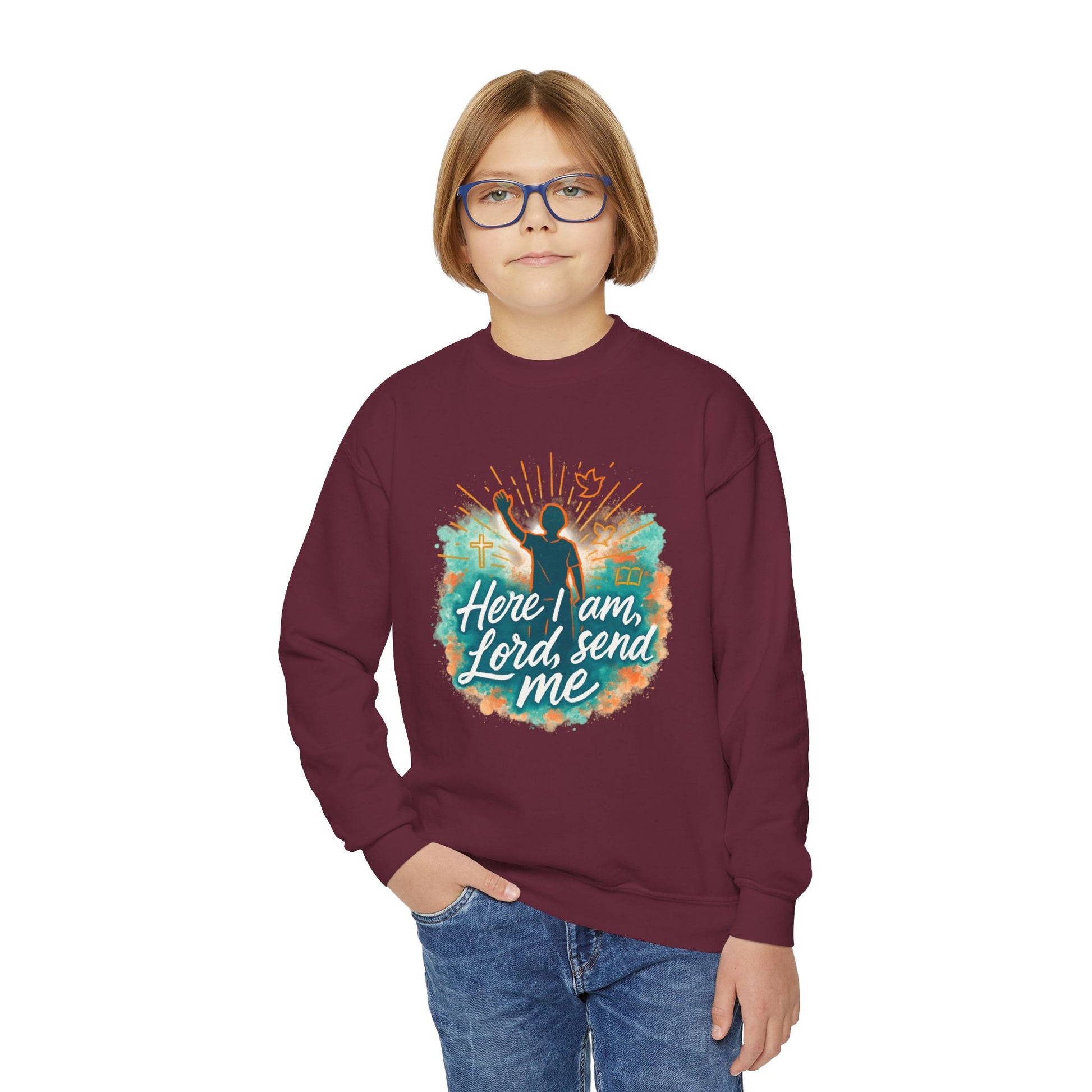 Youth Crewneck Sweatshirt: Here I am Lord Send Me, Christian Apparel, Faith-Based Gift, Religious Youth Wear, Inspirational Sweatshirt